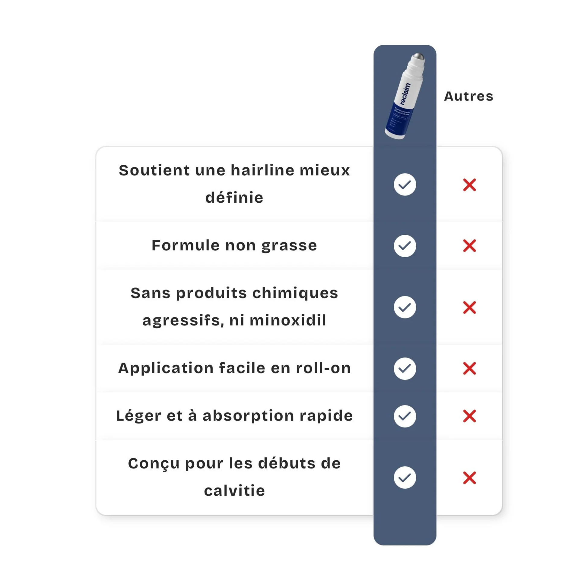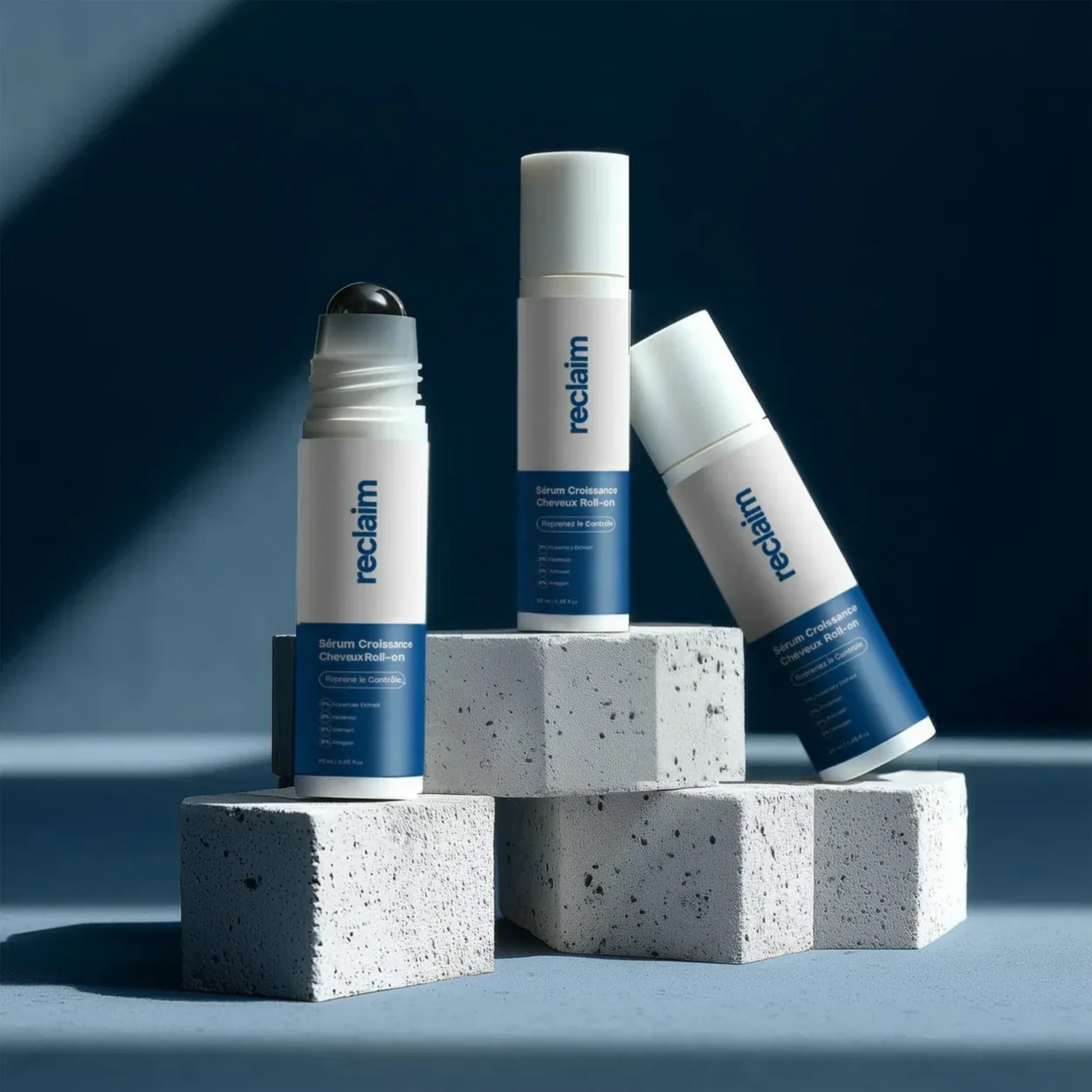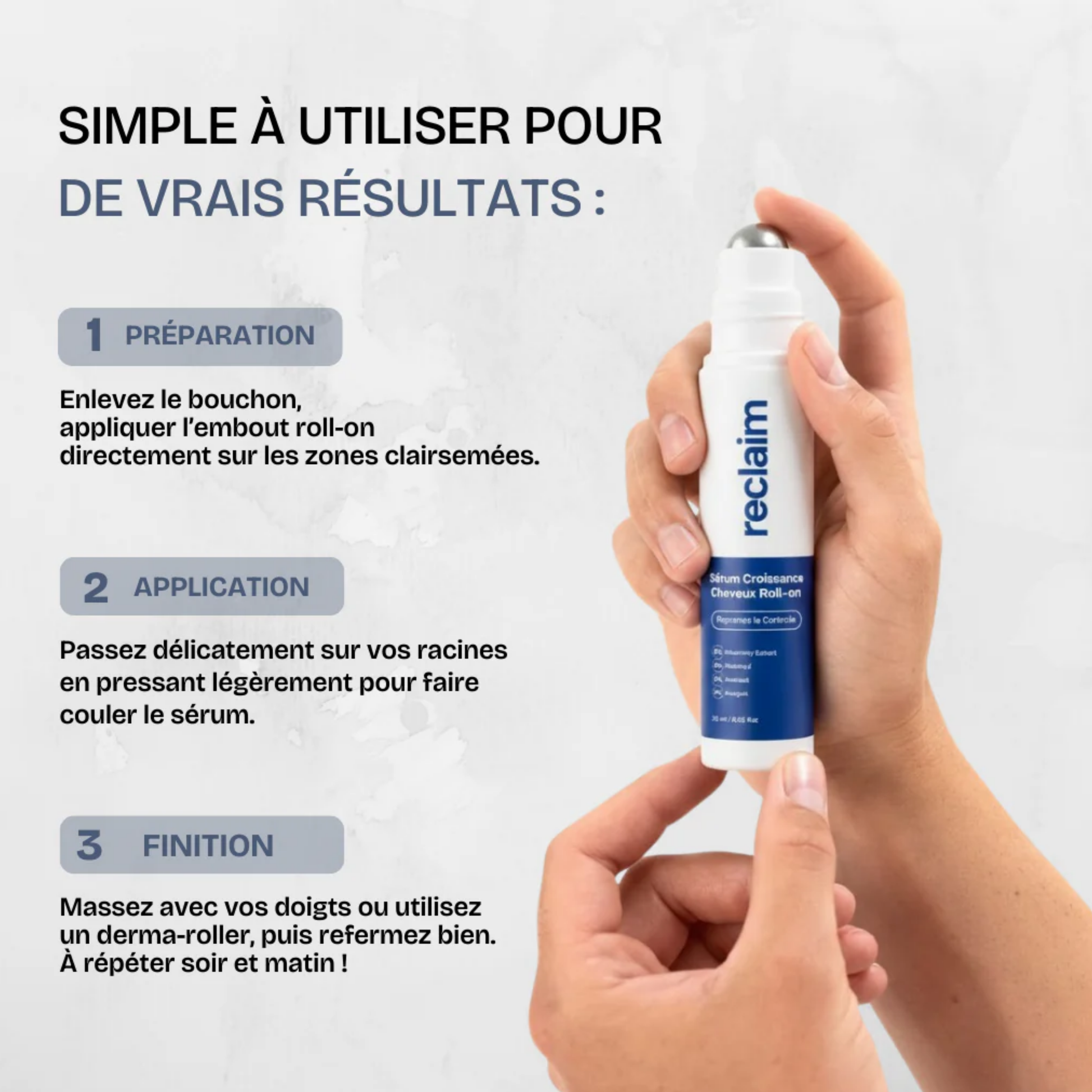 Enlevez le bouchon, appliquer l'embout roll-on directement sur les zones clairsemées.