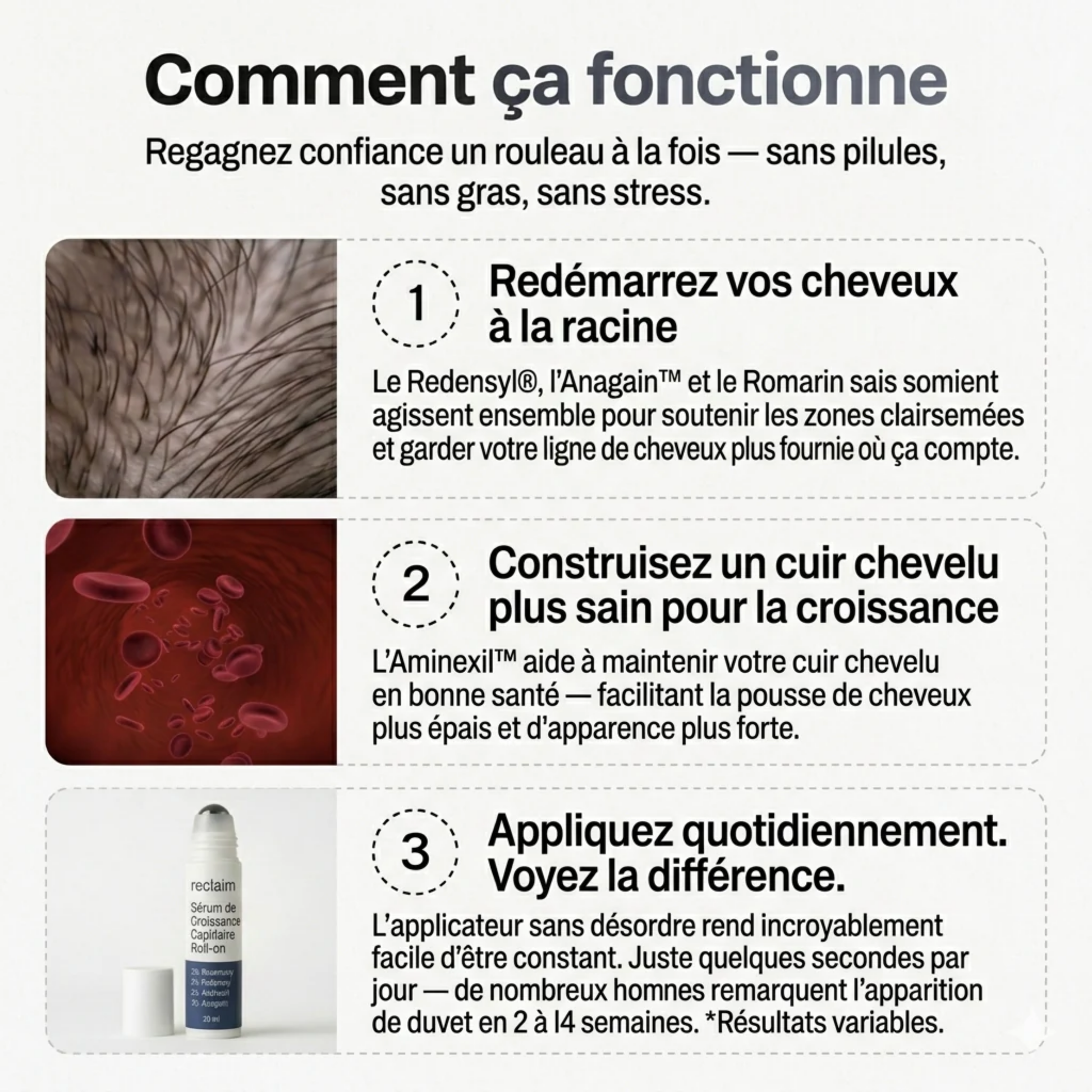 « Sous la douche je voyais des mèches partout. Semaine 2, presque plus rien. Je pensais pas que ça irait aussi vite. »