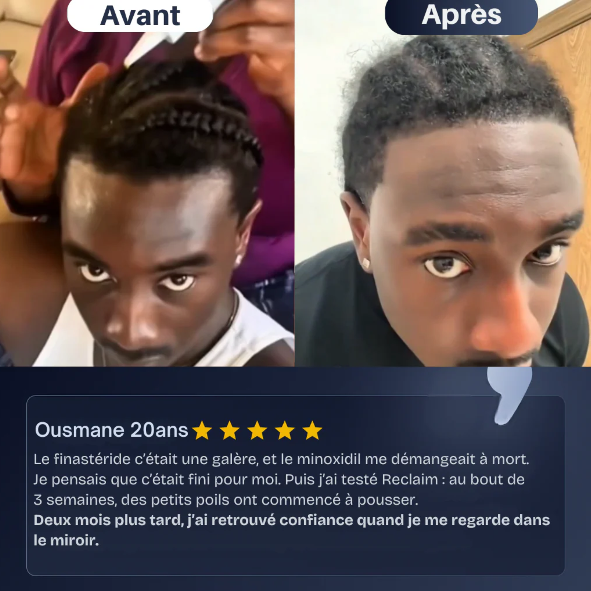 « J'ai essayé des dizaines de produits sans résultat. Ce sérum est le premier à avoir un vrai effet sur ma repousse. Mon coiffeur l'a remarqué ! »